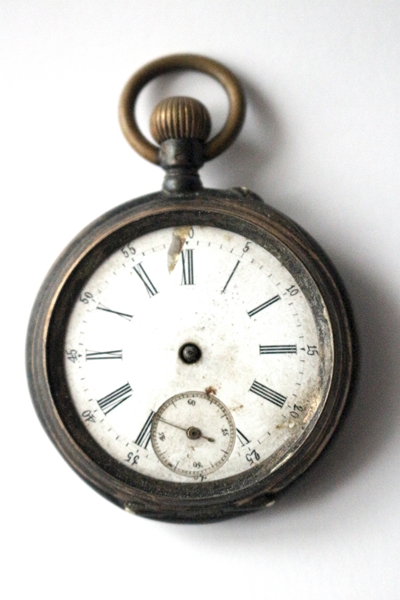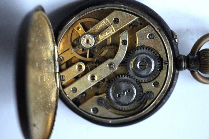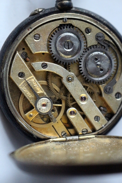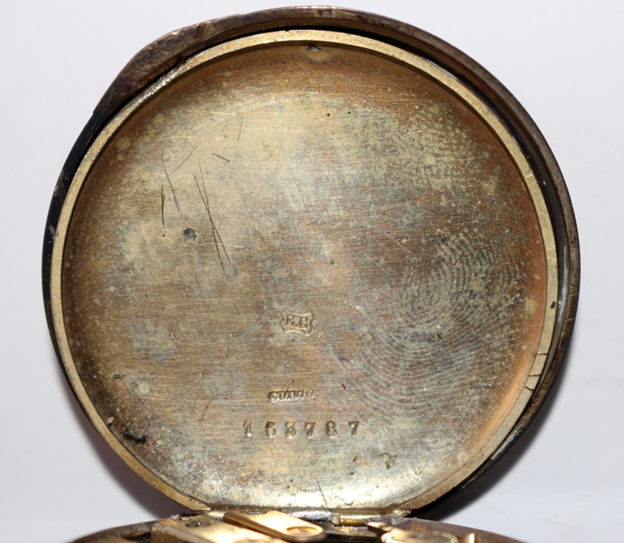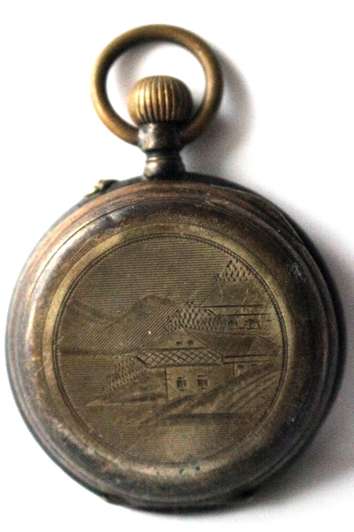 Taschenuhr, Gehäuse 800er Silber, mit Marke und eingeritzter Schriftzug, Innendeckel: Cuivre (Kupfer), Marke E.C. für Eggli & Cie., Schweiz, Nummer: 163787, weißes Zifferblatt mit römischen Ziffern für die Stunden und arabischen Ziffern für die Minuten. Ein kleines Hilfszifferblatt für die Sekunden befindet sich im unteren Bereich. Die Krone und der Bügel weisen Gebrauchsspuren auf und das Zifferblatt ist gealtert und beschabt, Zeiger fehlen, Abbildung auf hinterem Deckel außen