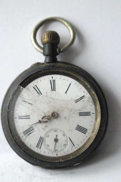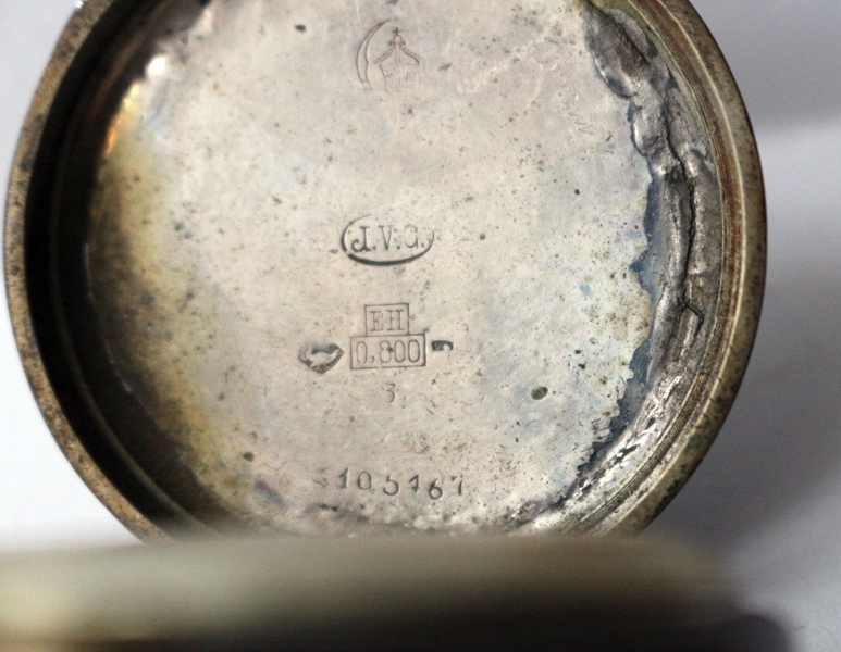 Taschenuhr, Gehäuse 800er Silber, mit Marke Deckel innen: Die Punzierung "0.800", Gehäuse aus 800er Silber, Punzierung "J.V. Eh" (oder "J.V.E.") ist das Herstellerzeichen für J.V. Eh, einen bekannten Uhrenhersteller. "EH" in einem Quadrat ist ein weiteres Herstellerzeichen. Daneben Punze Auerhahn für Schweiz, im Deckel oben Halbmond und Krone für Silberzeichen in Deutschland. Der Halbmond steht für Silber, die Krone für die Reichskrone. Nummer: "105467" ist die Seriennummer des Gehäuses., das Zifferblatt ist weiß (wahrscheinlich Emaille) mit schwarzen römischen Ziffern für die Stunden und arabischen Ziffern im Sekunden-Hilfszifferblatt. Es weist Risse und Abnutzungsspuren auf. Der große Zeigern fehlt, Das Glas ist oben ausgebrochen, Gesamtgewicht 76,0 g