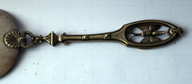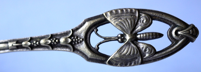 WMF Jugendstil Tortenheber, um 1900, versilbert, mit 2 Punzen "N" für Nürnberg, andere nicht erkennbar, Der durchbrochene Griff zeigt einen plastischen Schmetterling. Die Laffe (Heberfläche) mit dekorativem Muster. Maße 30,0 cm x 7,0 cm, 98 g