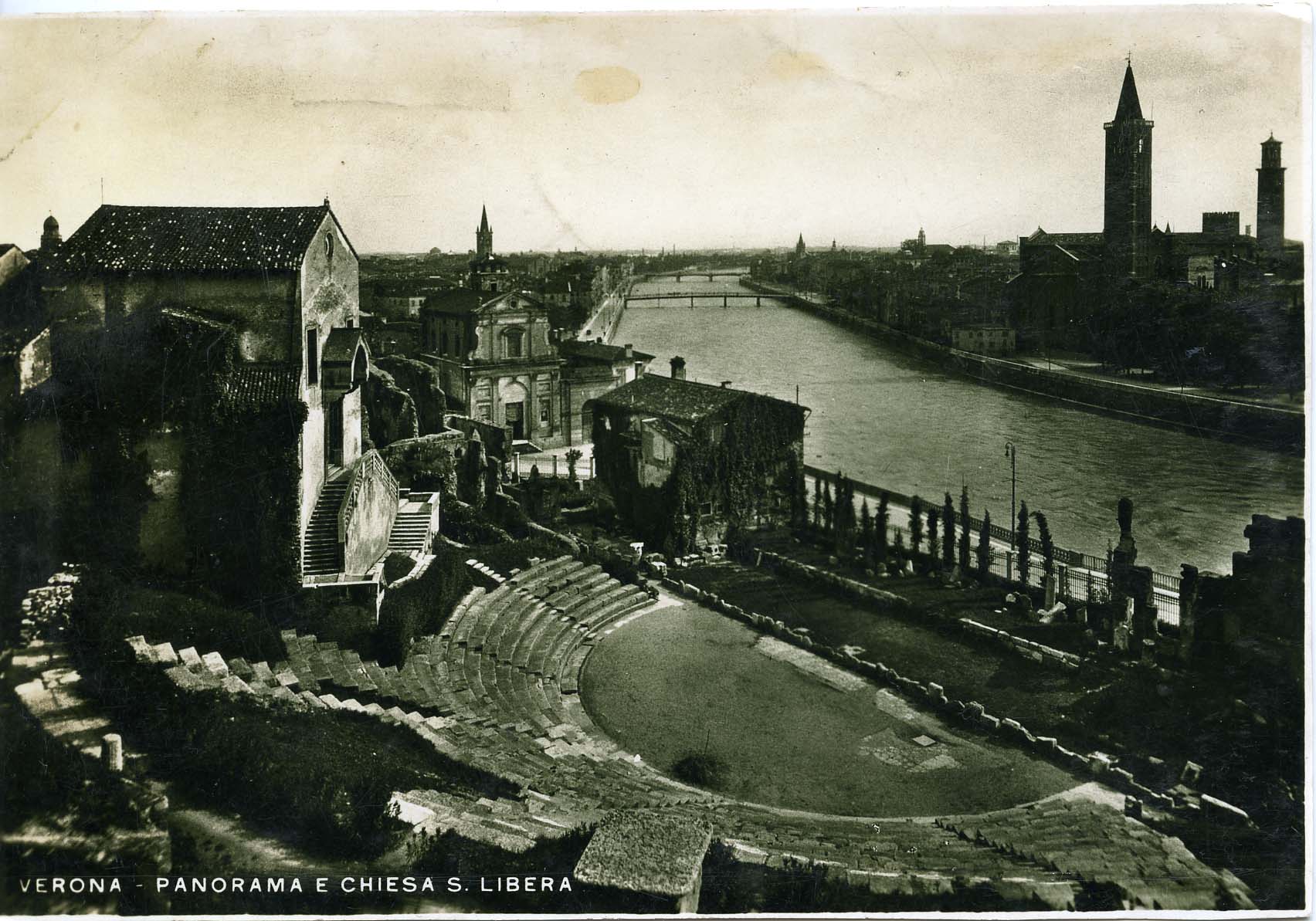 AK/Postkarte Verona, Panorama e Chiesa S. Libera 4d gestempelt, römisches Theater (Teatro Romano) in Verona mit Blick auf die Etsch und die Kirche Santa Libera. Maße 10,1 x 14,5 cm, beschnitten