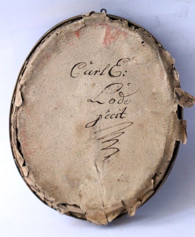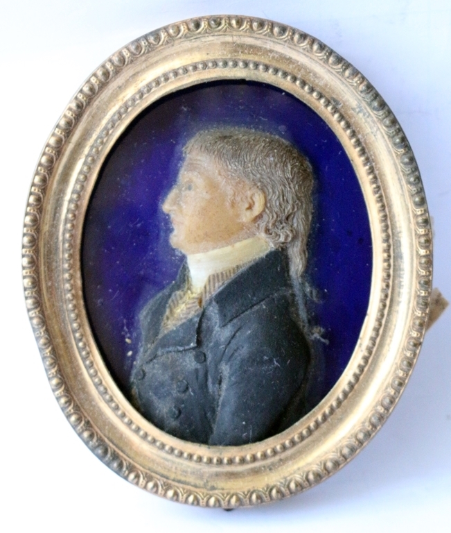 Ovales Miniaturporträt eines Herrn, das vermutlich im 19. Jahrhundert, während des Biedermeier oder Empire-Stils entstand. Das Porträt stammt stilistisch aus dem frühen 19. Jahrhundert, der abgebildete Mann trägt Kleidung, die der Mode um 1800-1830 entspricht, mit einem hohen weißen Kragen und einem dunklen Rock. Wachs auf kobaltblauem Hintergrund (ev. Glas), Miniaturporträt mit vergoldetem, ovalem Metallrahmen mit Perlrandverzierung. Rückseite beschriftete: Carl E. Lode (1752 - 1838), Fecit (lateinisch für "hat es geschaffen"), Rahmenmaße: 10,5 x 9,2 x 1,6 cm; Rahmen verzogen und bestoßen, sichtbares Bild: 8,0 x 6,5 cm, eventuell war das Bild hinter Glas, dieses fehlt