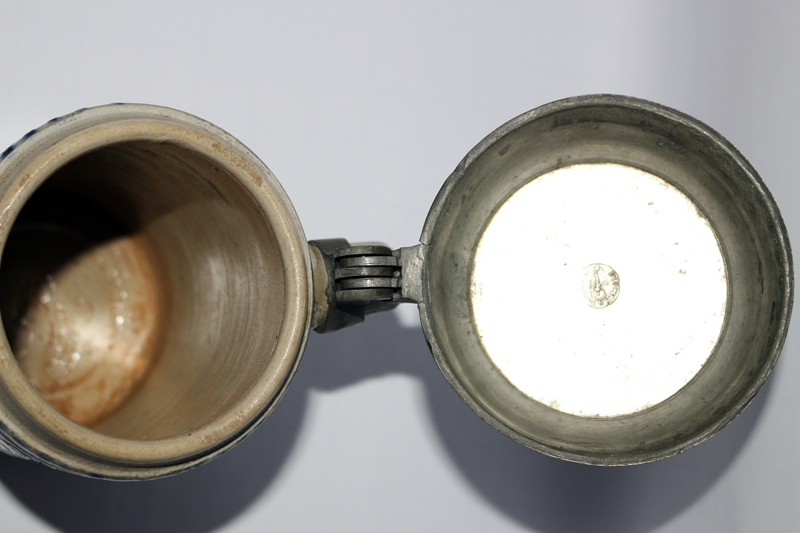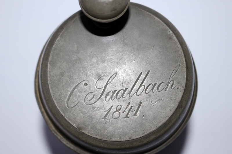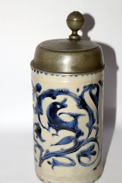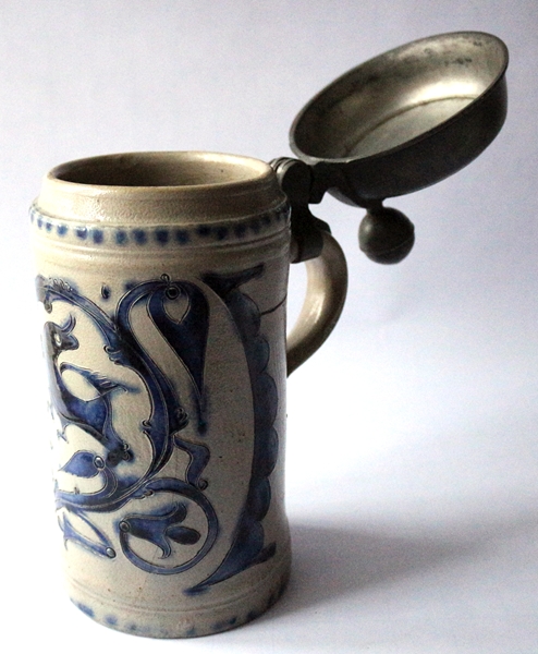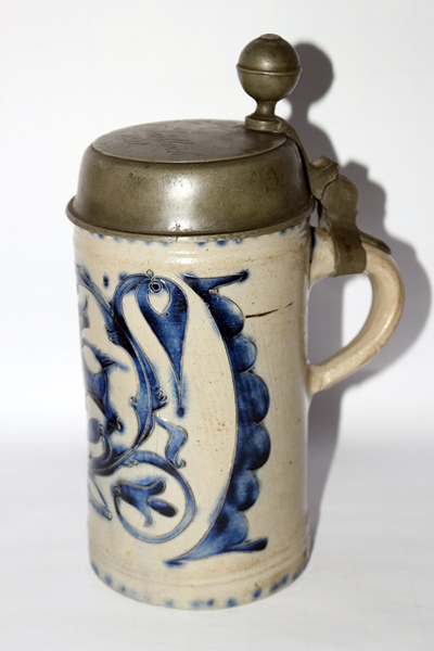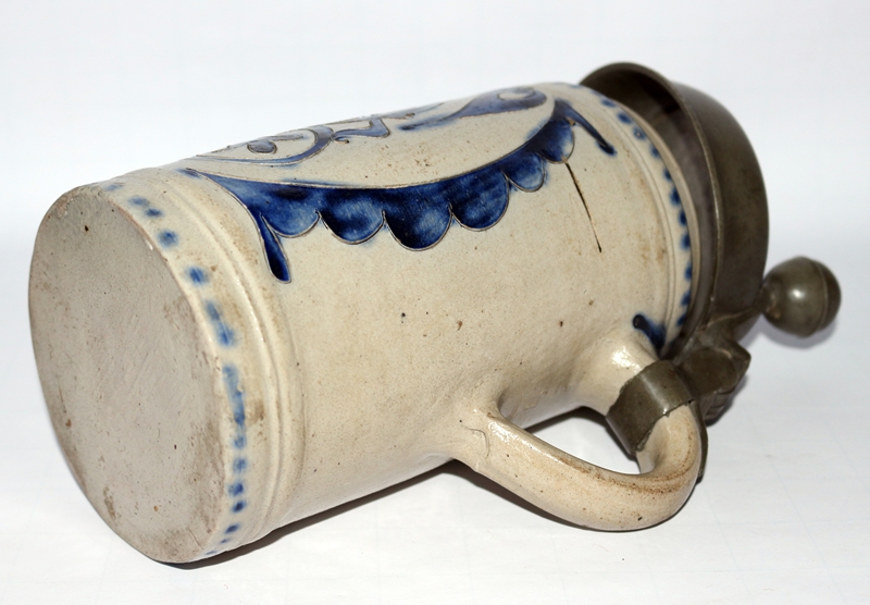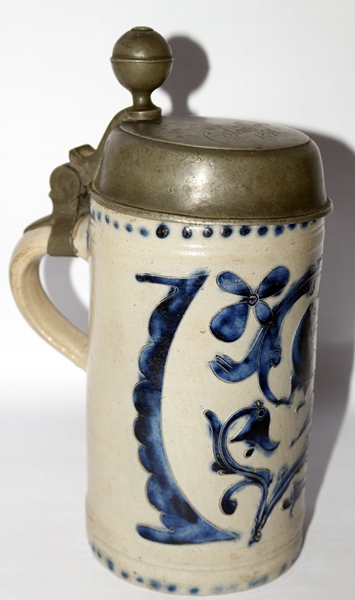 Antiker Westerwälder Steinzeugkrug mit Zinndeckel, Krug aus salzglasiertem, grauem Steinzeug, mit geritzten Floralmotiven und möglicherweise springenden Hirschen in Kobaltblau bemalt. Zinndeckel mit Kugel und eingeritzten Namen mit Jahreszahl, Im Innendeckel eingedrückter Stempel mit Figur und Umschrift beginnend mit "Fischer...", weiteres nicht lesbar, wohl gepunzt Johann Friedrich Fischer, Gera (1794-1861), Maße Höhe mit Knopf 24,5, Höhe mit Deckel 21,0 cm; Dm 10,5 cm
